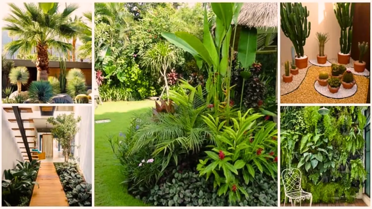A proposta é simples: trazer a natureza para dentro de casa ou para áreas externas compactas com folhagens grandes, texturas variadas, vasos pendentes e uma profusão de plantas tropicais. A composição rica em camadas e alturas cria profundidade visual e uma sensação imersiva, como se você estivesse em meio à mata.